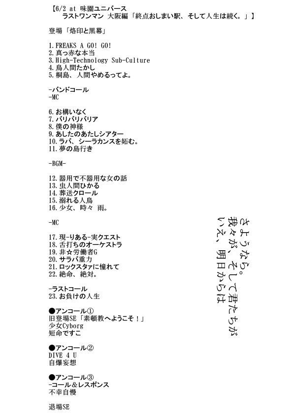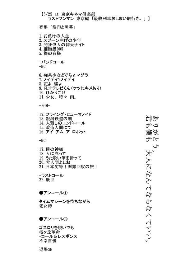 このセトリの画像だとメイデイの×が表示されてないの気になる。BGMは夢の出口だった。